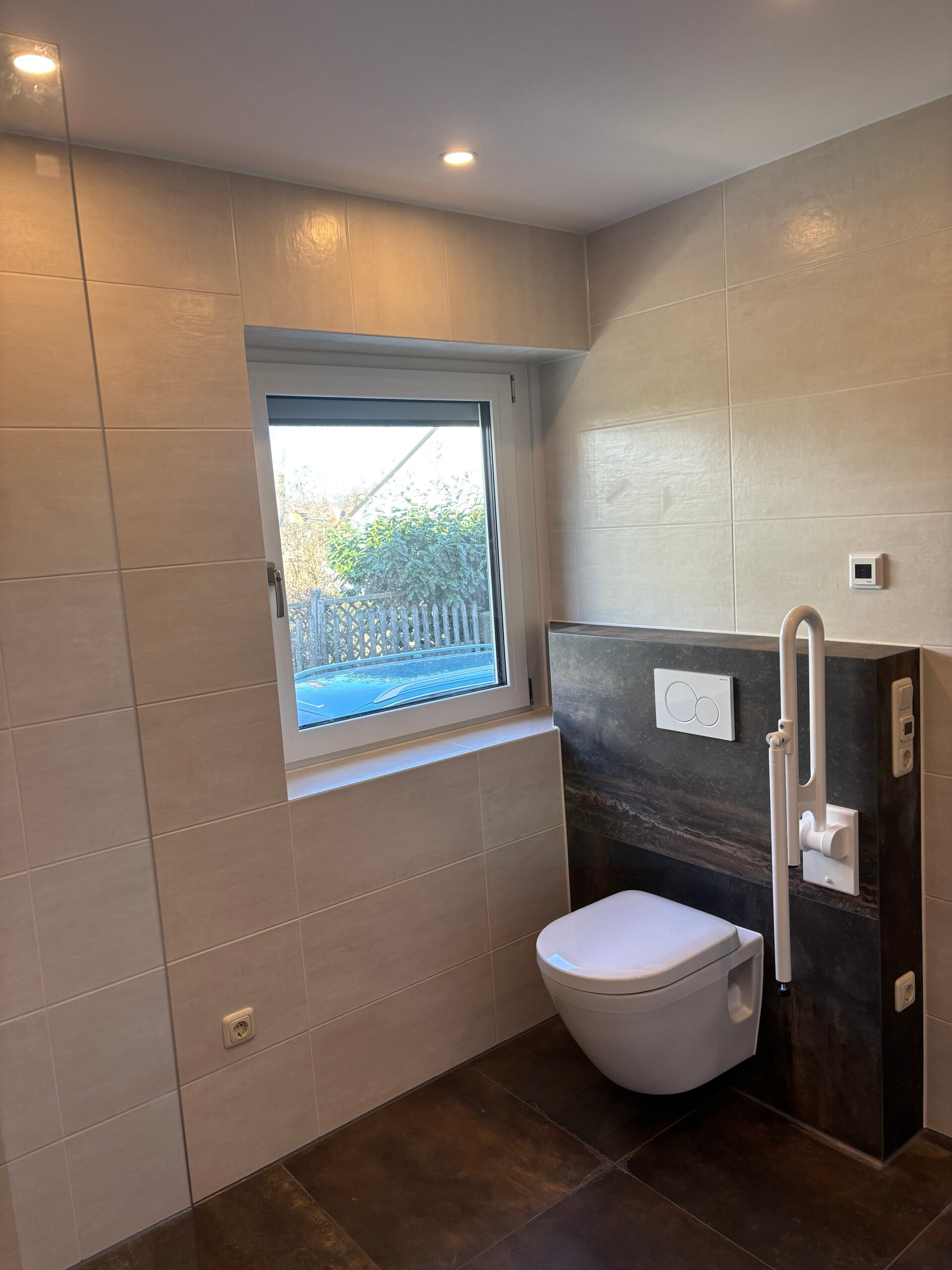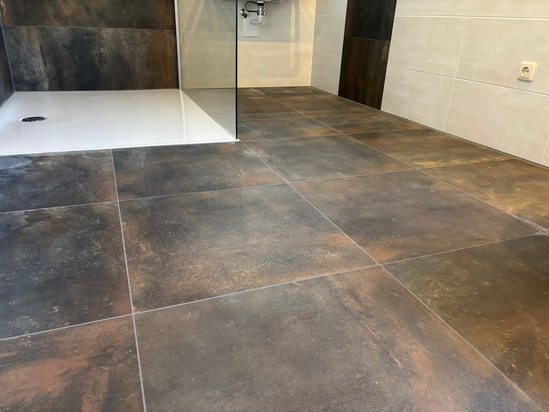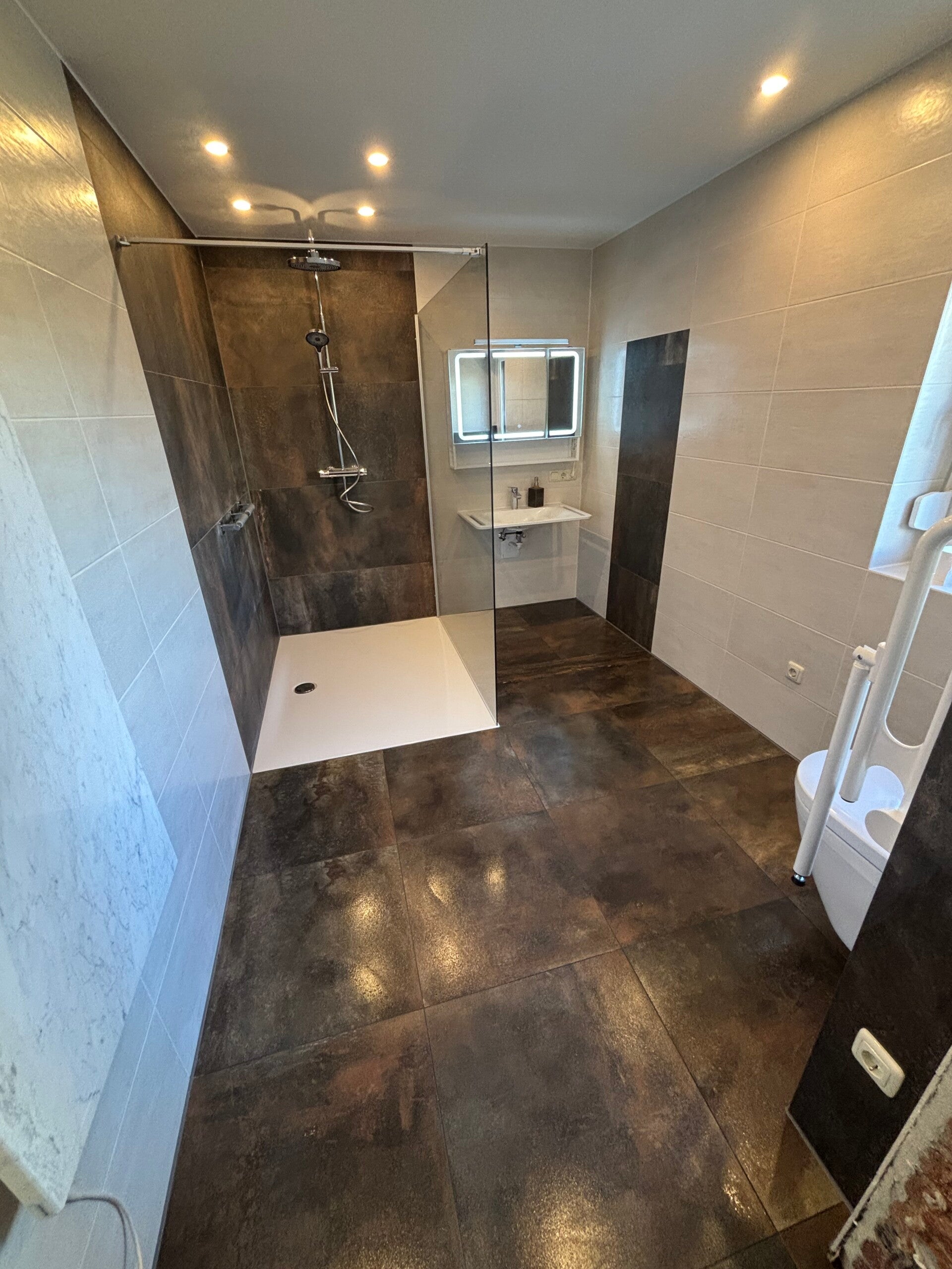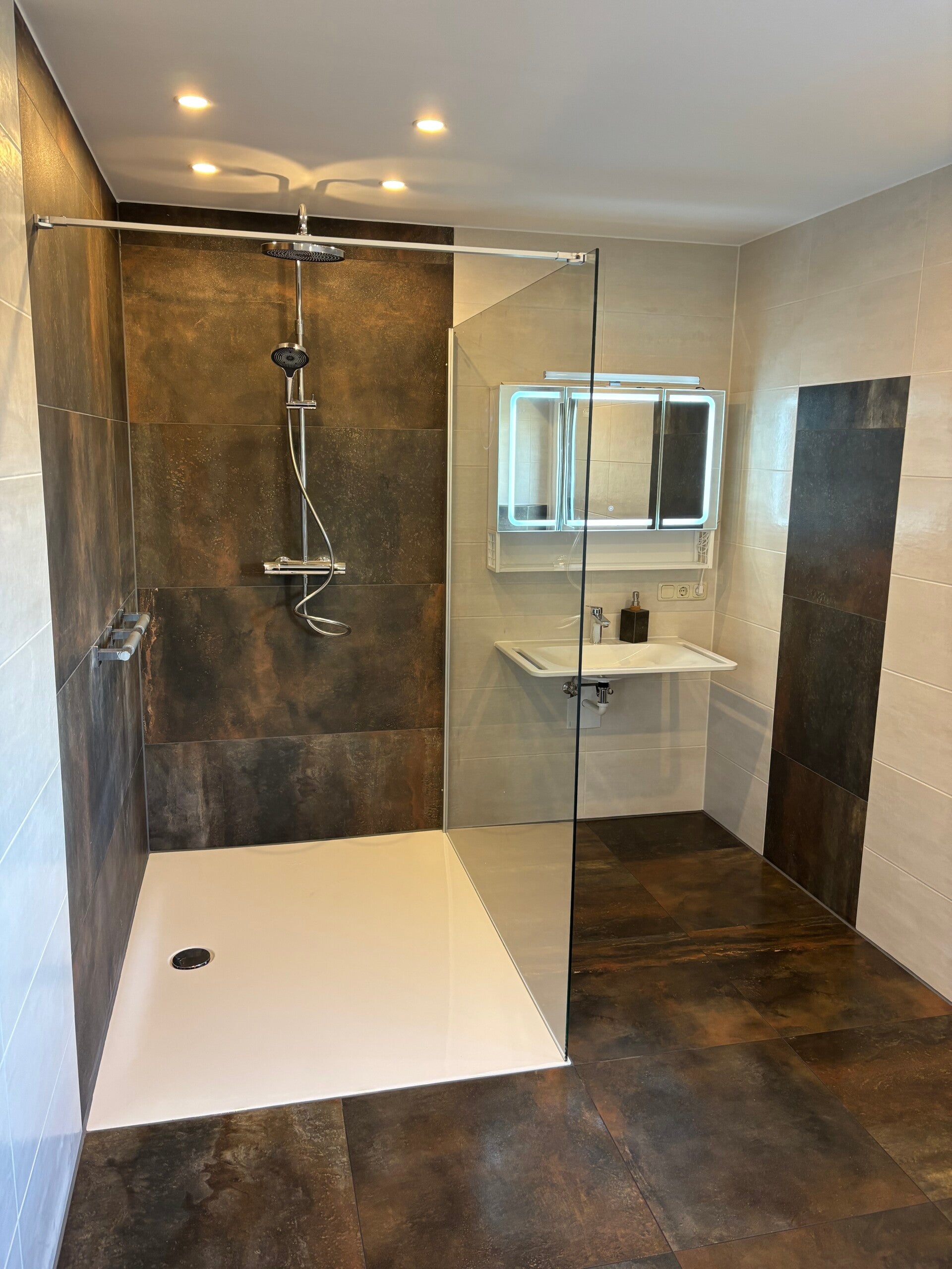 Diese komplette Badsanierung vereint hochwertige Materialien, präzise Ausführung und durchdachte Details. Sauber gearbeitete Jolly-Kanten sowie die Verklebung mit Akemi Colour Bond sorgen für ein stimmiges Gesamtbild. Mit der Schlüter-DITRA-HEAT im gesamten Bodenbereich und in einem Wandbereich neben dem Waschbecken wurde zusätzlicher Komfort geschaffen – unter anderem als praktische Handtuchheizung. Abgerundet wird das Projekt durch einen individuell gefertigten Seifenspender aus der Bodenfliese, der sich harmonisch in das Design einfügt.